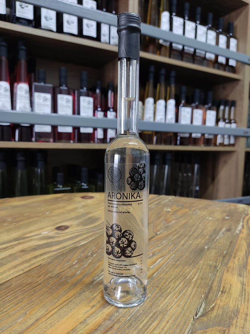Reife Aroniabeeren ergaben nach Reinigung und Gärung durch den Destillationsprozess im Kupferkessel Aroniabrand, ARONIK. Dieser Weinbrand mit besonders scharfem Geschmack ist in Glasflaschen von 0,1 l, 0,2 l, 0,5 l, 0,7 l verpackt.