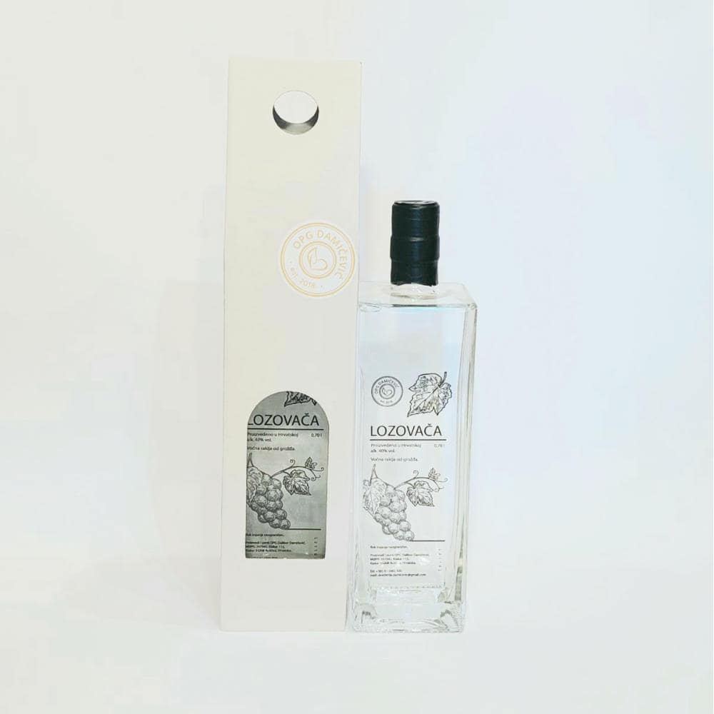 Nach der manuellen Ernte, dem Entfernen der Stiele und der Gärung der Trauben und der Herstellung von Schnaps in einem Kupferkessel haben wir einen 40% LOZOVAČA-Schnaps erhalten, der sich durch seinen reichen und vollen Geschmack auszeichnet.