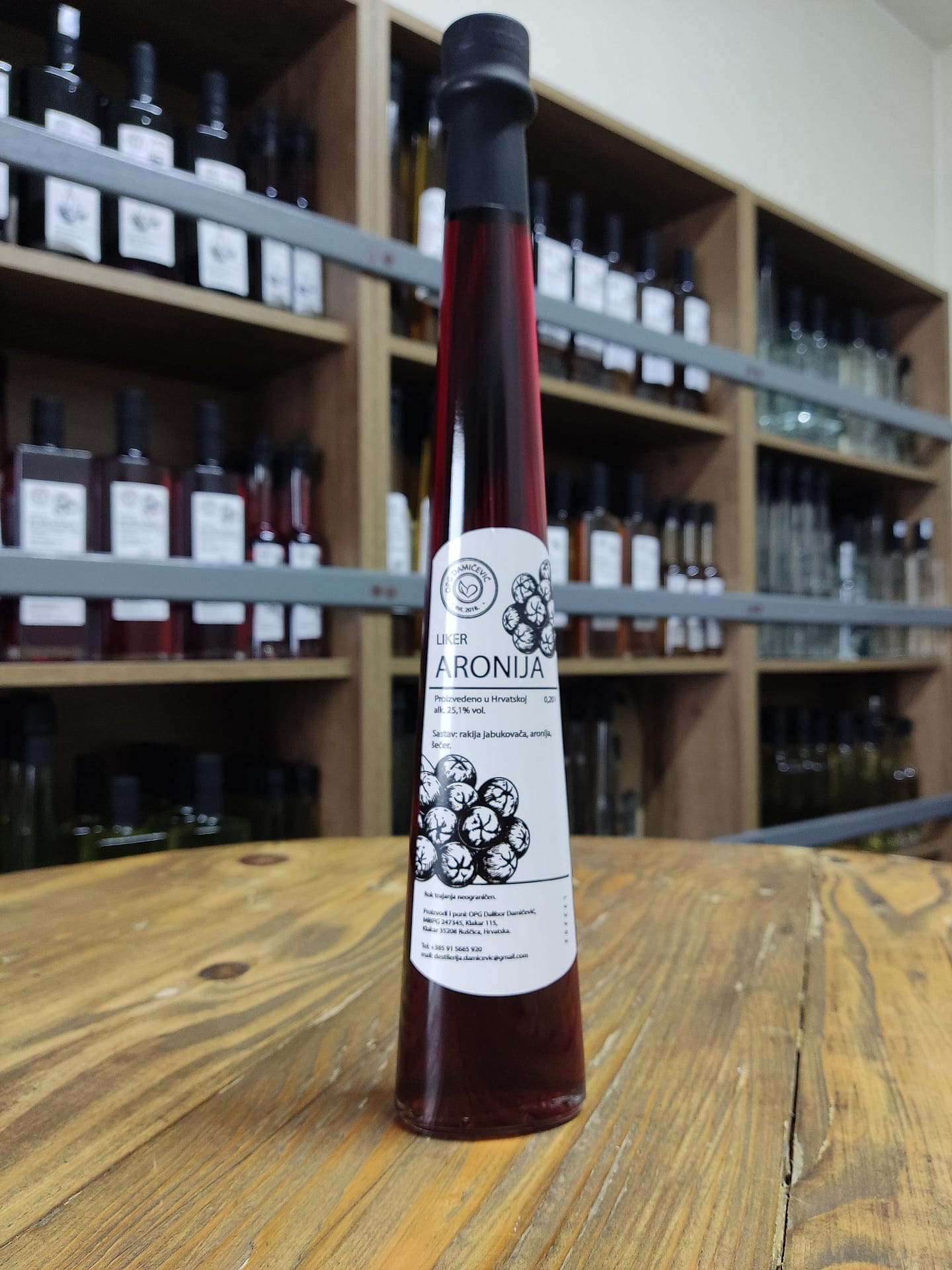 Liker je proizveden od isključivo naše ne tretirane aronije koja je ručno brana, čišćena i prana. Za bazu je uzeta naša rakija jabukovača. Ovaj liker privlači svojom tamnocrvenom bojom i punim okusom. Pakiran je u elegantne staklene boce od 0,1l, 0,2l.