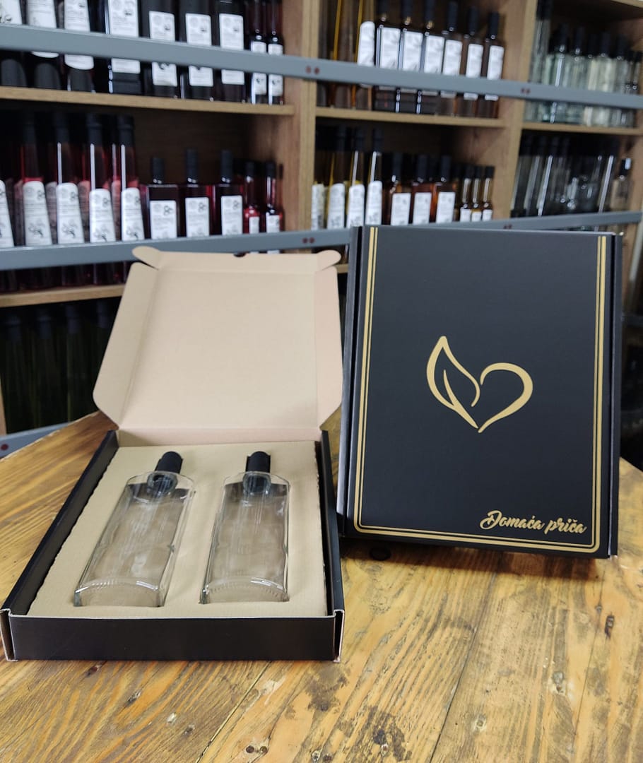 Poklon paket Domaća priča (velika) – Uživajte u kombinaciji dva vrhunska alkoholna pića (0,5 L) u pakiranju koje priča svoju priču.