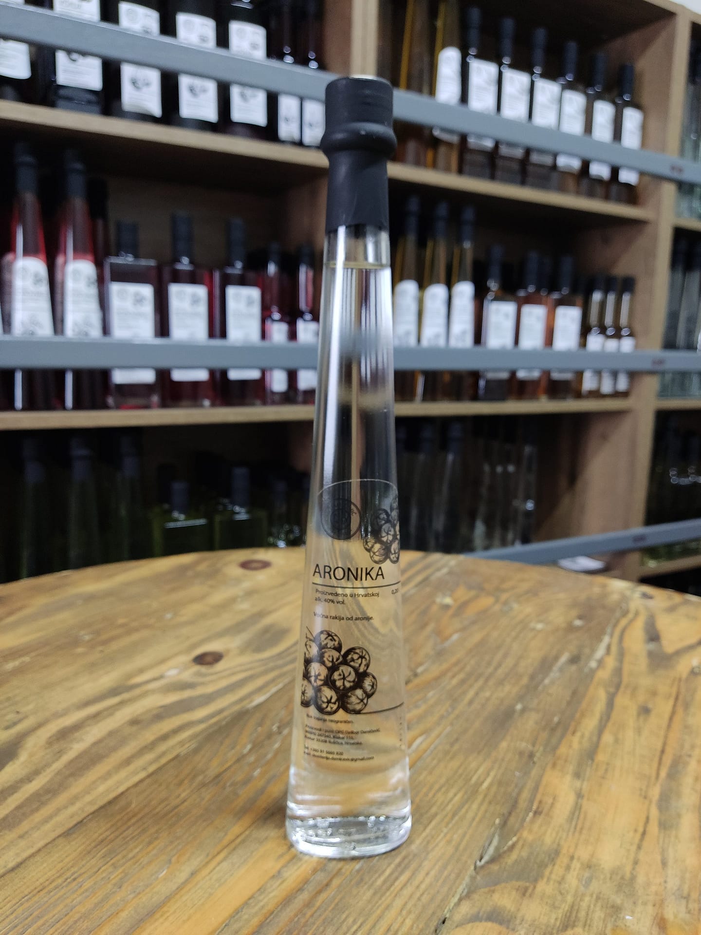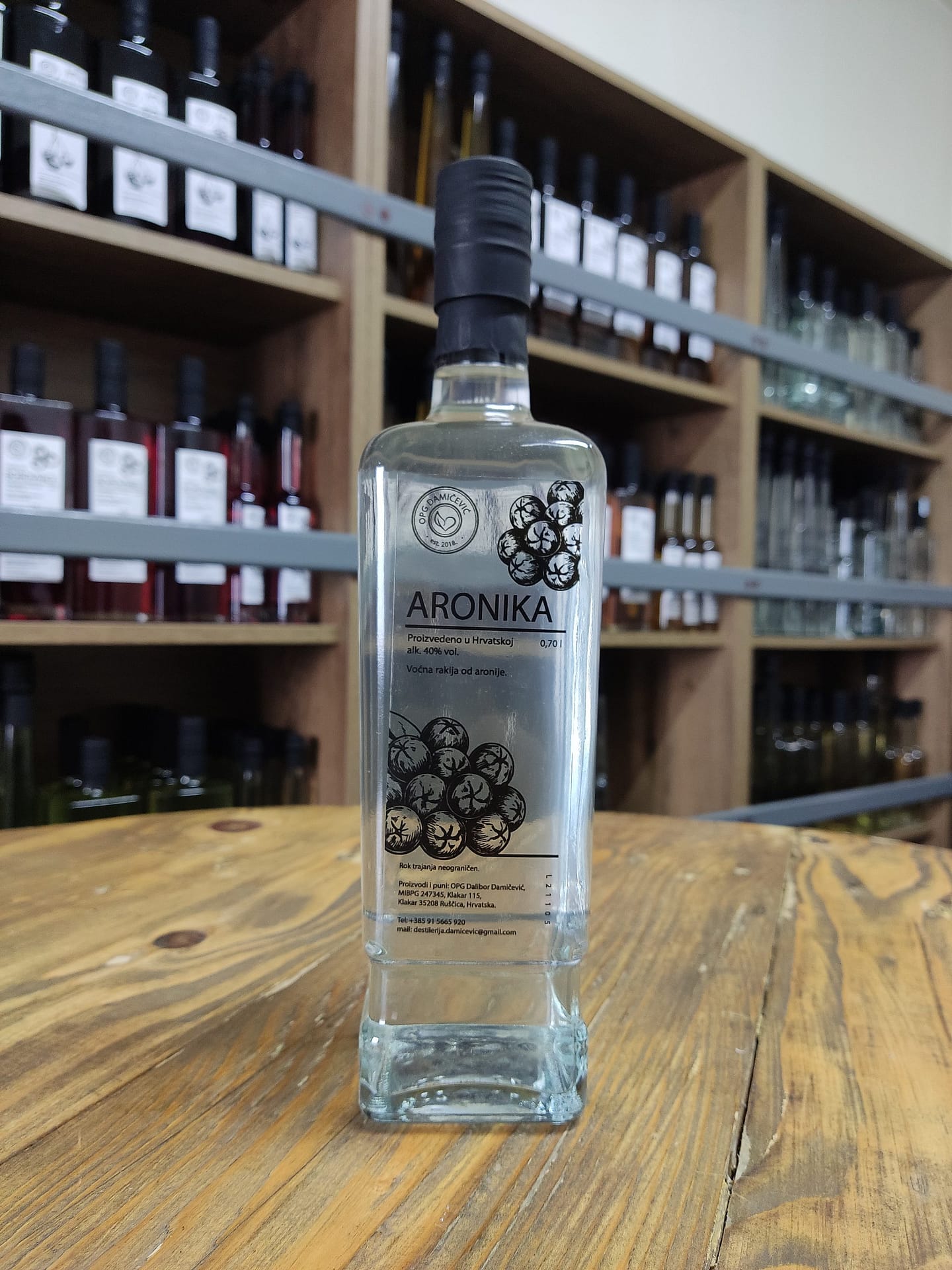 Zrele bobice aronije, nakon čišćenja i fermentacije, destilirane u bakrenom kotlu, daju našu aroniku – rakiju posebnog, oporog okusa. Dostupna u bocama od 0,1 L, 0,2 L, 0,5 L i 0,7 L.